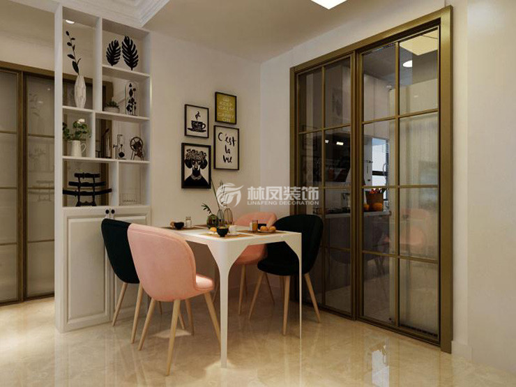 现代风格餐厅设计对色彩的搭配是比较讲究的,墙上的挂画餐座椅的颜色每一处都是你中有我我中有你。