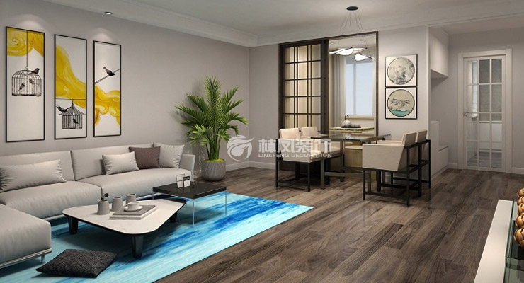 客厅采用地板铺贴,给人温馨又不失质感的感觉,墙面采用米白色,更是给人一种干净温暖的感觉,挂画采用活力黄作为点缀,地毯采用海浪的纹样,整体营造出一个温馨而又不失活力的空间。