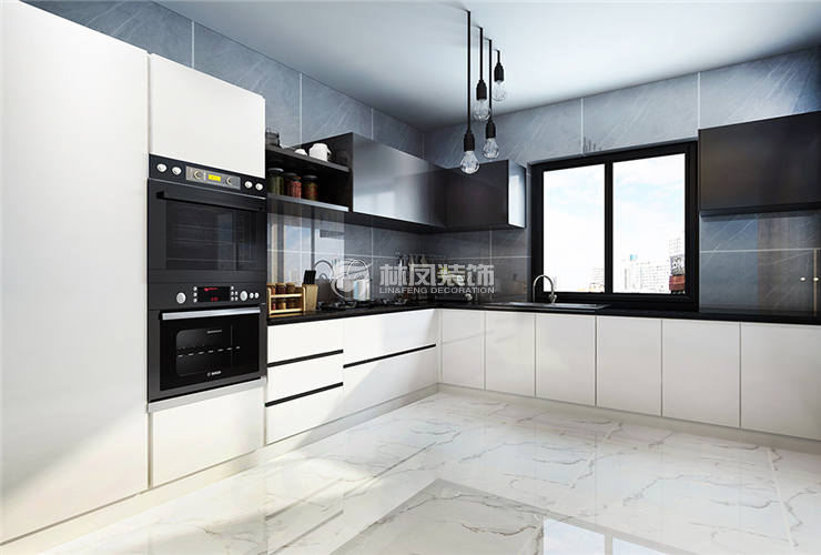 敞开式厨房,使空间变大,使功能区域完美划分,厨房墙砖采用地砖上墙,使空间更具有时代感。