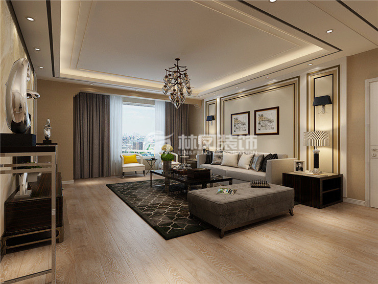 三室两厅一厨两卫,高层整体采用美式风格,色调以深色为主,体现美式的居家感和温馨感。