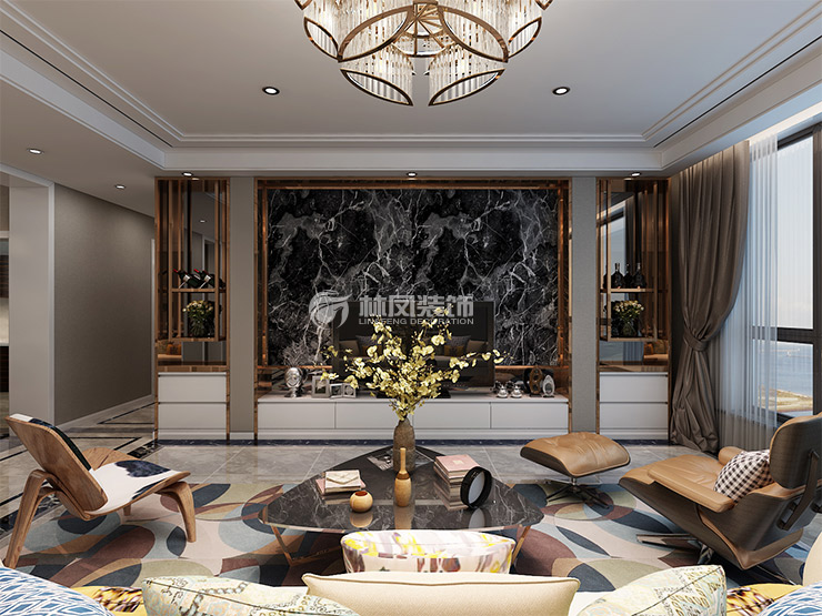 客厅拥有令人羡慕的采光,选用布艺沙发和实木单人位,温软的阳光照射下来,这种自然地气息会让人有种置身自然地感觉,背景墙采用理石装饰,黄铜的收边,及轮廓的配色,嵌入式的设计都是抢眼之处,两侧的镂空柜和装饰柜在美观的同时,也增加了储物空间,简单的吊顶,却因这盏吊灯显得更加尊贵。