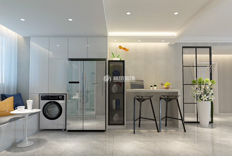 餐桌摒弃了传统的餐桌,根据房主的生活需求换成了一个深受年轻一族喜爱、追捧的的吧台设计,并且通过高柜的一体设计把滚筒洗衣机与对开门冰箱巧妙的组合到一起,整齐大气,收纳十足,一体的卡座设计更是在增加收纳空间的同时,提升了此空间的使用率,三两好友,团聚于此,其乐融融,美哉乐哉!