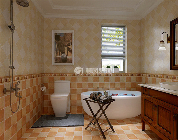 本案的卫生间风格一看就是典型的美式风,仿古以及腰线的使用、高端大气的实木手盆在配上仿古壁灯恰到好处。同时设计师在有限的空间里又安排了一个浴缸,让主人在一天的繁忙工作之后可以回到家中进行一个舒适的放松。
