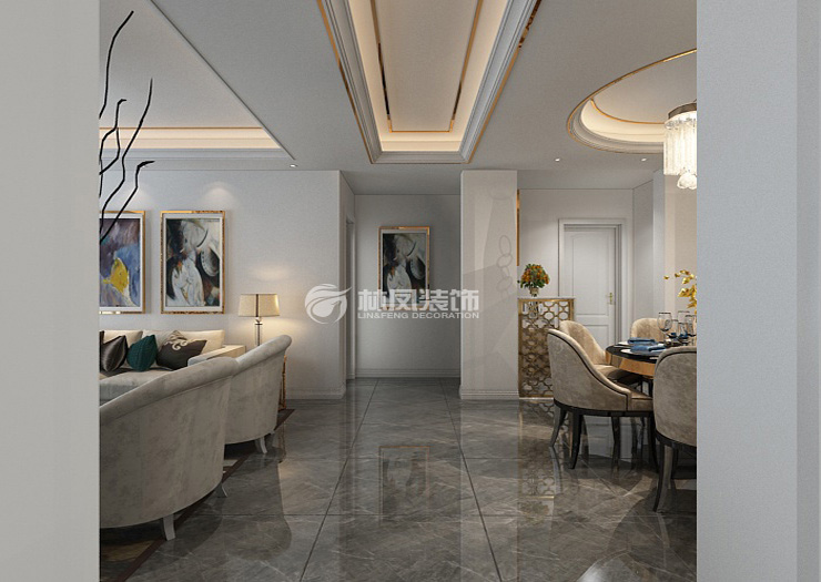 繁复的饰线布满了客厅,搭配大气的灰色布艺沙发,在华丽的水晶吊灯衬托下,尽显经典欧式的富丽堂皇。置身其中,仿佛穿越到18世纪的欧洲。