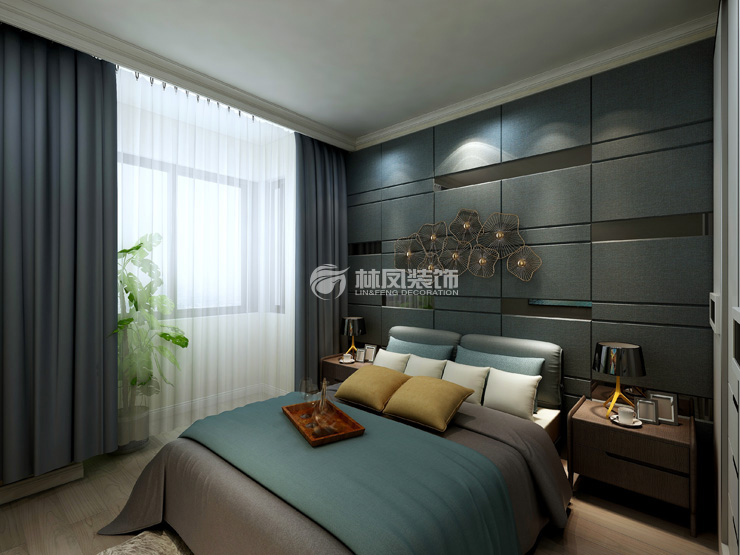 4.卧室整体贴淡黄色浅纹理壁纸,营造出温馨舒适的睡眠环境,床头背景采用硬包装饰,嵌入灰色镜面,软硬结合,颜色更是跟窗帘的颜色相呼应,增加整个空间的整体感、立体感。