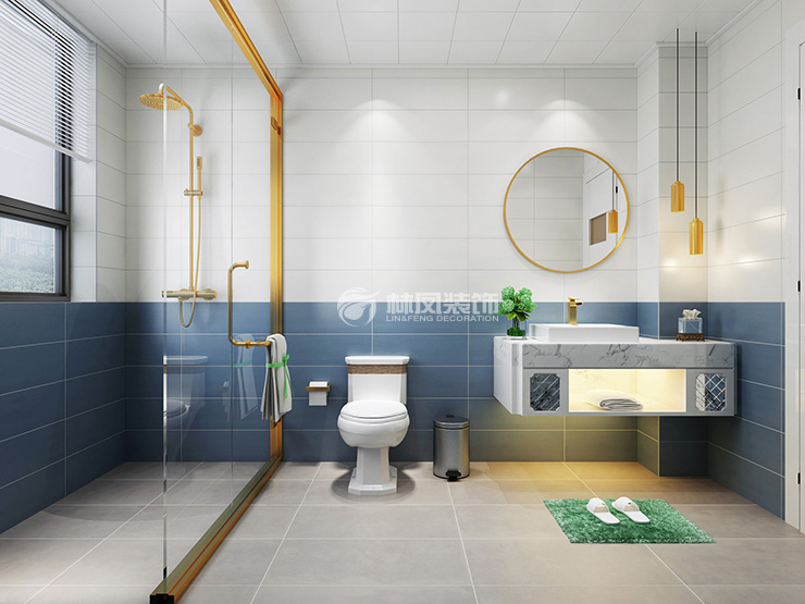 卫生间墙面运用白、蓝色块拼接手法,显得空间简单大方。地面用淡色长方型瓷砖,显空间宽阔,不拥挤。