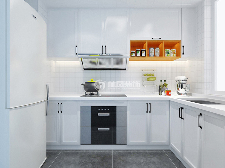 灰色地砖带给空间沉稳感觉,白色柜体则带给空间靓丽感,白色小块墙砖起到点睛之笔。