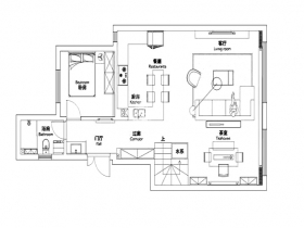 本案以稳重的中式原木色家具搭配现代层次分明的现代吊棚,地面以柔光的棕灰色地砖搭配边线突出空间层级,几副中式装饰画结合素色壁纸搭配‘营造出一个悠闲舒适、清雅的中式风格。
