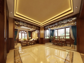 本案采用的是中式风格,设计上使用木结构以及对称的设计来体现中式风格,色彩上多使用棕色家具来打造一种沉稳厚重的装修效果,棚顶采用木线条造型达到简洁并且多样式的空间。