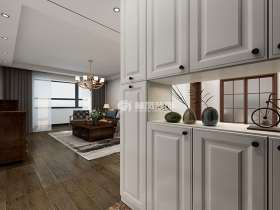本案例定位为简美风格,为了整体空间大小,家具主要采用深色实木家具和白色的柜体搭配,并在空间上考虑到户型的情况和业主想法,重点在实用性和储藏空间下了很大的功夫。