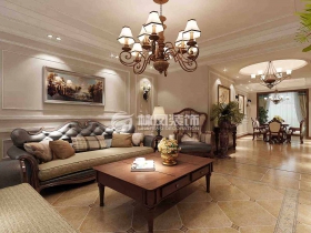 本案设计风格为欧式美式风格,采用美式软装家具和地砖石材,与屋内的软装搭配更显舒适安逸。