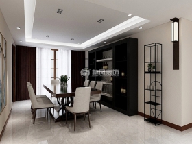 本案以稳重的港式原木色家具搭配现代层次分明的现代吊棚,地面以柔光的棕灰色地砖搭配边线突出空间层级,几副中式装饰画结合素色壁纸搭配,营造出一个悠闲、舒适、清雅的港式风格。