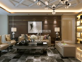 本案以稳重的港式原木色家具搭配现代层次分明的现代吊棚,地面以柔光的棕灰色地砖搭配边线突出空间层级,几副中式装饰画结合素色壁纸搭配,营造出一个悠闲、舒适、清雅的港式风格。