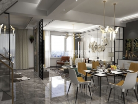本案跨度三层,是以现代黑白灰为基础,结合轻奢金属元素,营造出简单,奢华的视觉感受