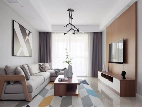 现代的居室主要表现在空间开敞、内外通透,以简洁的表现形式来满足人们对空间环境那种感性的、本能的和理性的需求,客厅采用拼色地毯和拼色墙壁挂画互相呼应,使得整体简约而不简单,木色背景墙则体现了主人作为教师的沉稳,现代风格不仅舒适还很实用同时展现了温馨舒适的居住环境。简洁而不简单,追求以实用为主的思想。