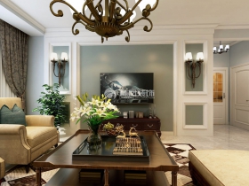 本方案为简约美式风格,棚顶采用成品石膏线作为主要造型,整体采用淡蓝色作为墙面的主色,利用墨绿色作为点缀提亮了整个空间,使本来单调的空间更加有层次感,使空间更加富有生机